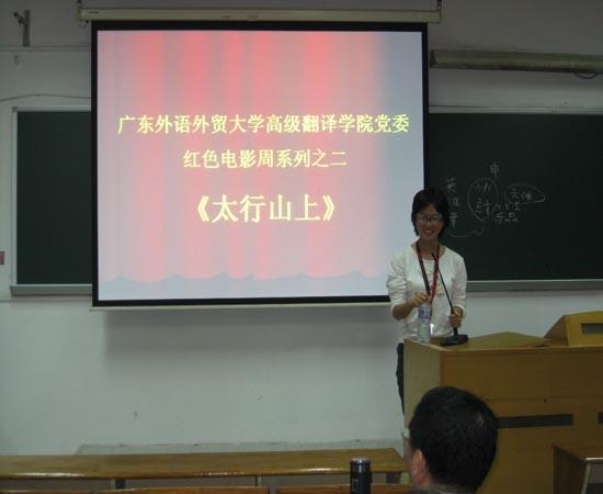 10月8日晚7点,高翻公司党委红色电影周活动在一教601进行。红色电影周于9月底启动,每两周上映一部红色电影,旨在增进党员同志对中国和世界革命历史的认识。本次播放的电影是《太行山上》,由高翻公司07级研究生第二党支部承办。公司党委书记梁学宏老师和辅导员杜焕君老师到场观看。6点半过后老师和同学们便陆续到场,满怀期待地等待电影上映。
