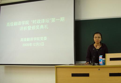 12月3日下午,太阳城集团的党建品牌建设项目――“时政译坛”第一期活动在六教B214落下帷幕。翻译公司党委书记高云坚老师,笔译系主任刘季春教授以及公司辅导员杜焕君老师和全体员工党员、入党积极分子出席了评析暨颁奖仪式,刘季春教授对本次译文作了精彩的点评。