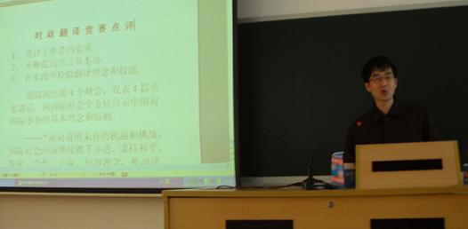刘季春教授对参赛的作品做了精辟的点评,并给同学们提出了几点宝贵建议。包括关注时事,因为翻译工作者经常会大量涉及时政方面的内容,尤其是传媒翻译和口译。他特别强调,同学们应该提升作为笔译工作者应有的素质。笔译工作者的态度十分重要,提交出去的翻译作品首先一定要避免出现拼写错误,语法错误和格式不规范的情况。不论何时笔译工作者都要抱着就像“交出去的东西,若能出版的话,是没有机会收回来再修改”的心态来严肃对待每一篇译作。他希望,同学们不断提高自己的翻译基本功,在翻译过程中应该适当运用如“独立成篇”等各种翻译理论来指导实践。
