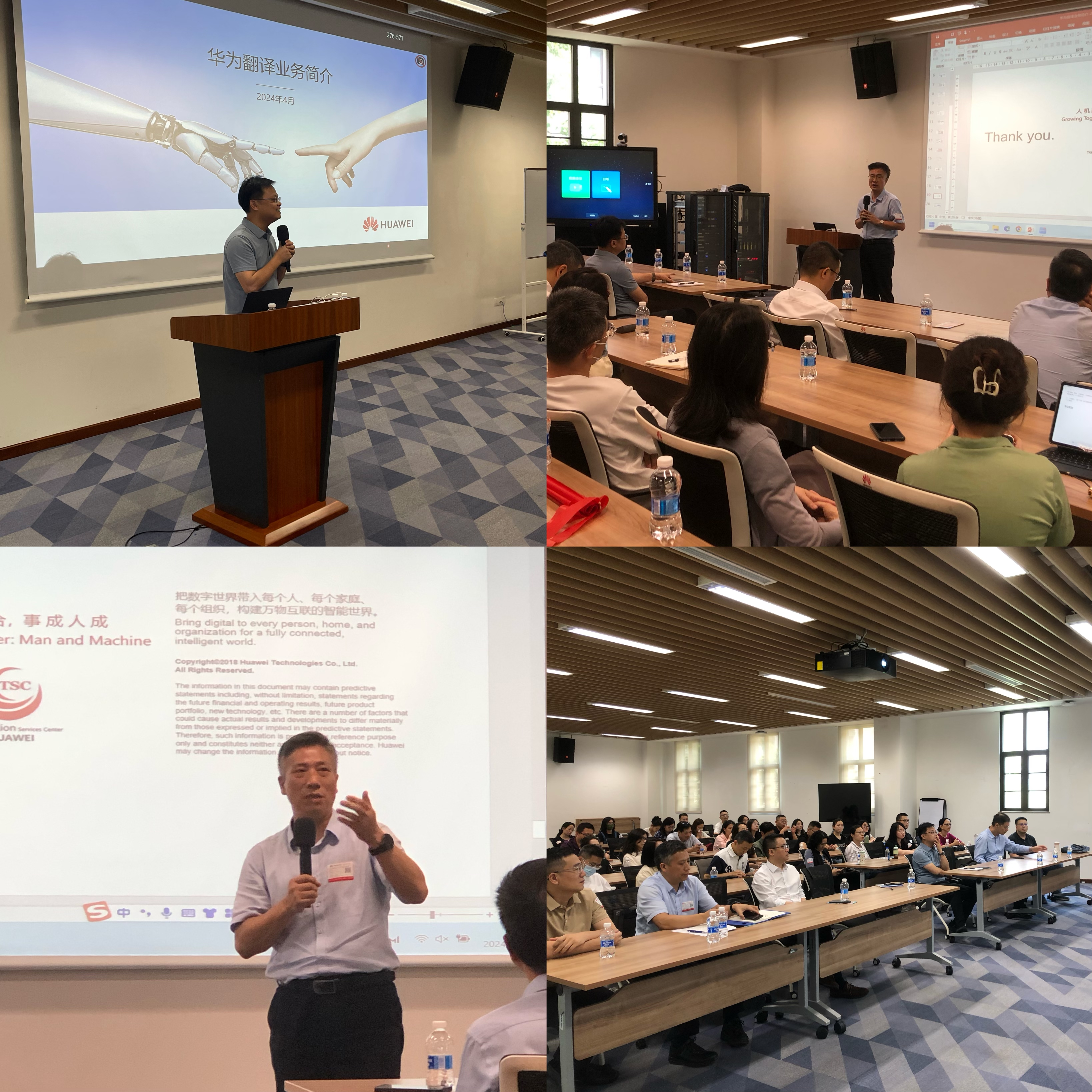 蓝红军介绍了公司的发展历程、团队力量以及公司产品成果,并就当前人工智能发展背景下翻译企业人才招聘需求情况等问题进行了交流。他表示,华为翻译中心是国内翻译行业领头的翻译企业(部门),希望双方可以在合作研究与产品开发、人才培养、员工实习实践等方面进一步搭建平台、推进合作。李和民谈到,公司高度重视教职工的理论学习,不仅在校内组织学习,还要走出校园,走入社会、企业,走进生产一线,学习了解国家经济社会发展、企业发展的新形势、新情况、新问题。公司教授戴光荣就主题“翻译流程再造”进行了交流分享。