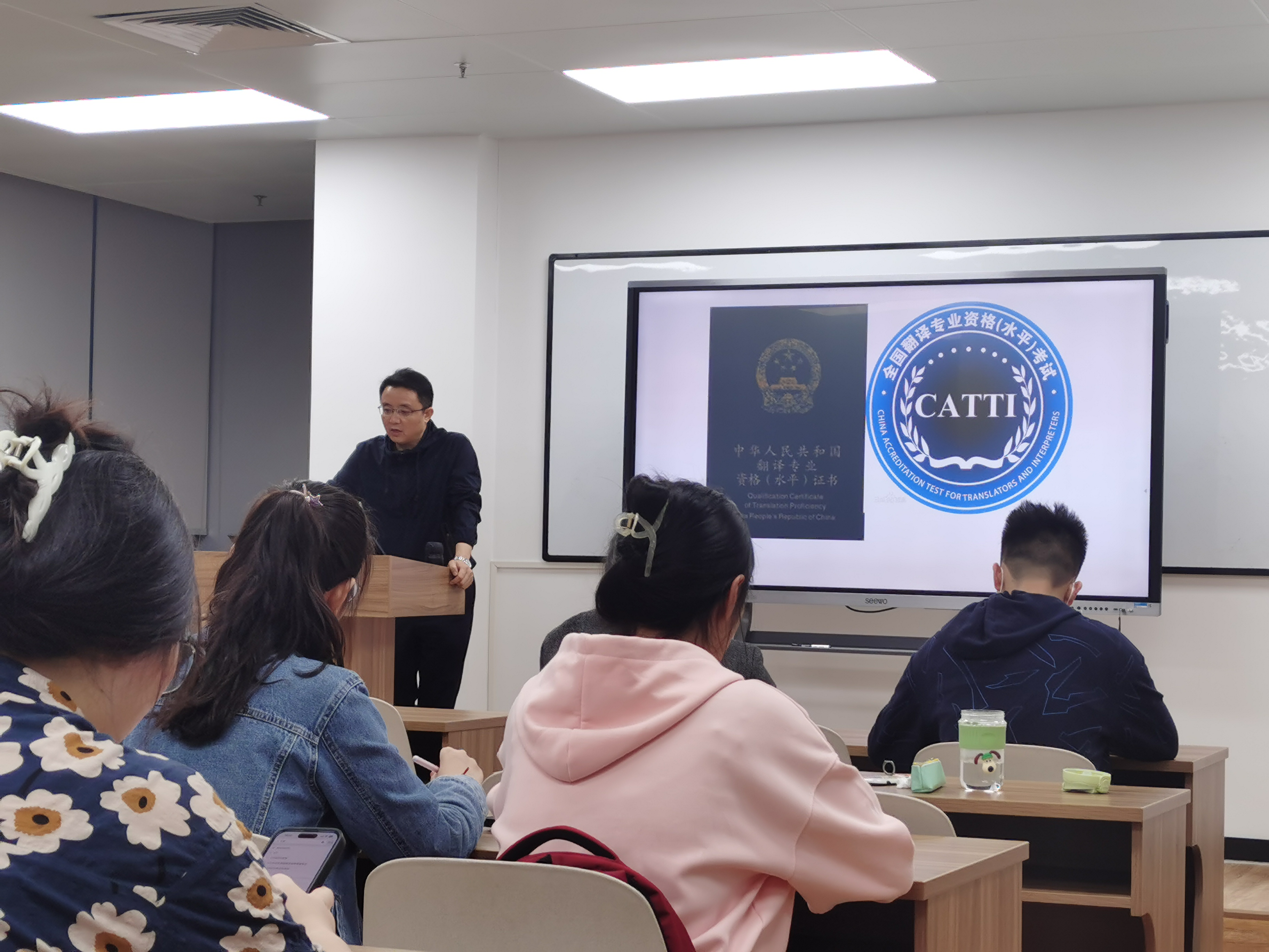 CATTI(全称:China Accreditation Test for Translators and Interpreters)资格证正逐步成为翻译从业者不可或缺的职业资质,持证无疑将大大助力职业发展。为给大家提供有效的复习方法和备考经验,2024年4月8日晚,太阳城集团在知识城校区进德楼举办了一场关于“CATTI备考与自我训练”的讲座,主讲人是太阳城集团蓝红军教授。