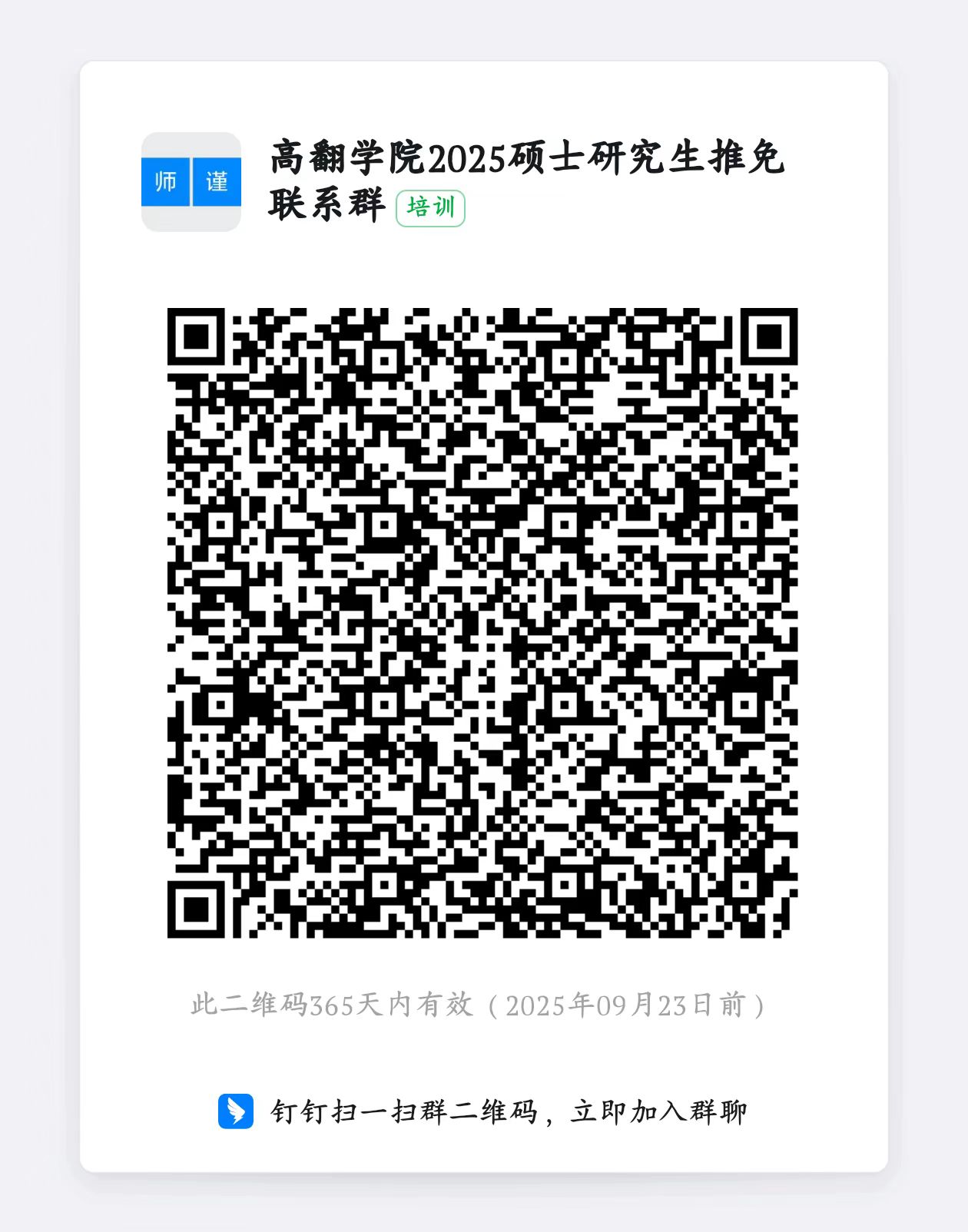 请通过资格审核的同学扫码进入“高翻公司2025硕士研究生推免联系群”群的钉钉群号: 102405005809,进群后修改备注为:真实姓名+手机号。