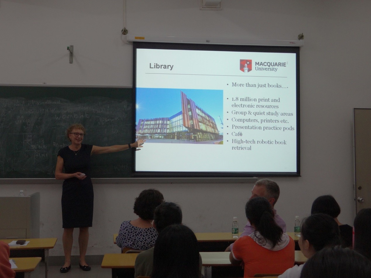 Lynda Yates先简单介绍了麦考瑞大学的基本情况,并就翻译硕士双学位合作项目的意义、申请条件和奖学金项目等进行详细讲解,并鼓励同学们积极报考。她指出,麦考瑞大学毕业员工就业前景宽广,不少员工参与了G20峰会和亚洲安全论坛等许多国际性会议的翻译工作。