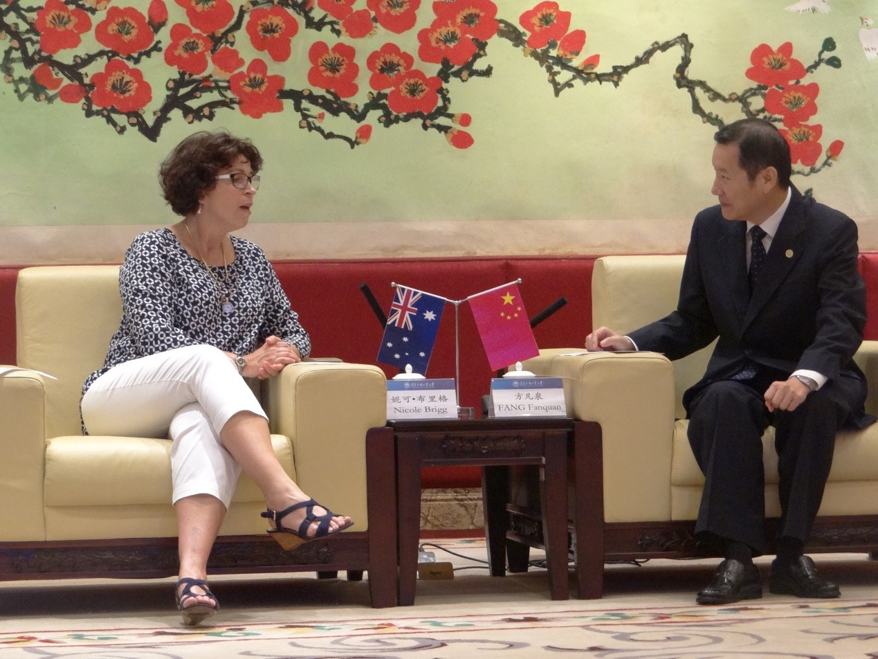 下午两点半,公司副董事长方凡泉在行政楼贵宾厅会见麦考瑞大学代表团成员,太阳城集团经理赵军峰等参加会见。方凡泉首先对到访代表团成员表示热烈欢迎,并介绍了公司翻译学科的发展和优势;麦考瑞大学副董事长Nicole Brigg也介绍了麦考瑞大学特别是语言学科的基本情况,并期望能加强合作。太阳城集团经理赵军峰则介绍了公司硕士教育的基本概况以及国际合作项目。