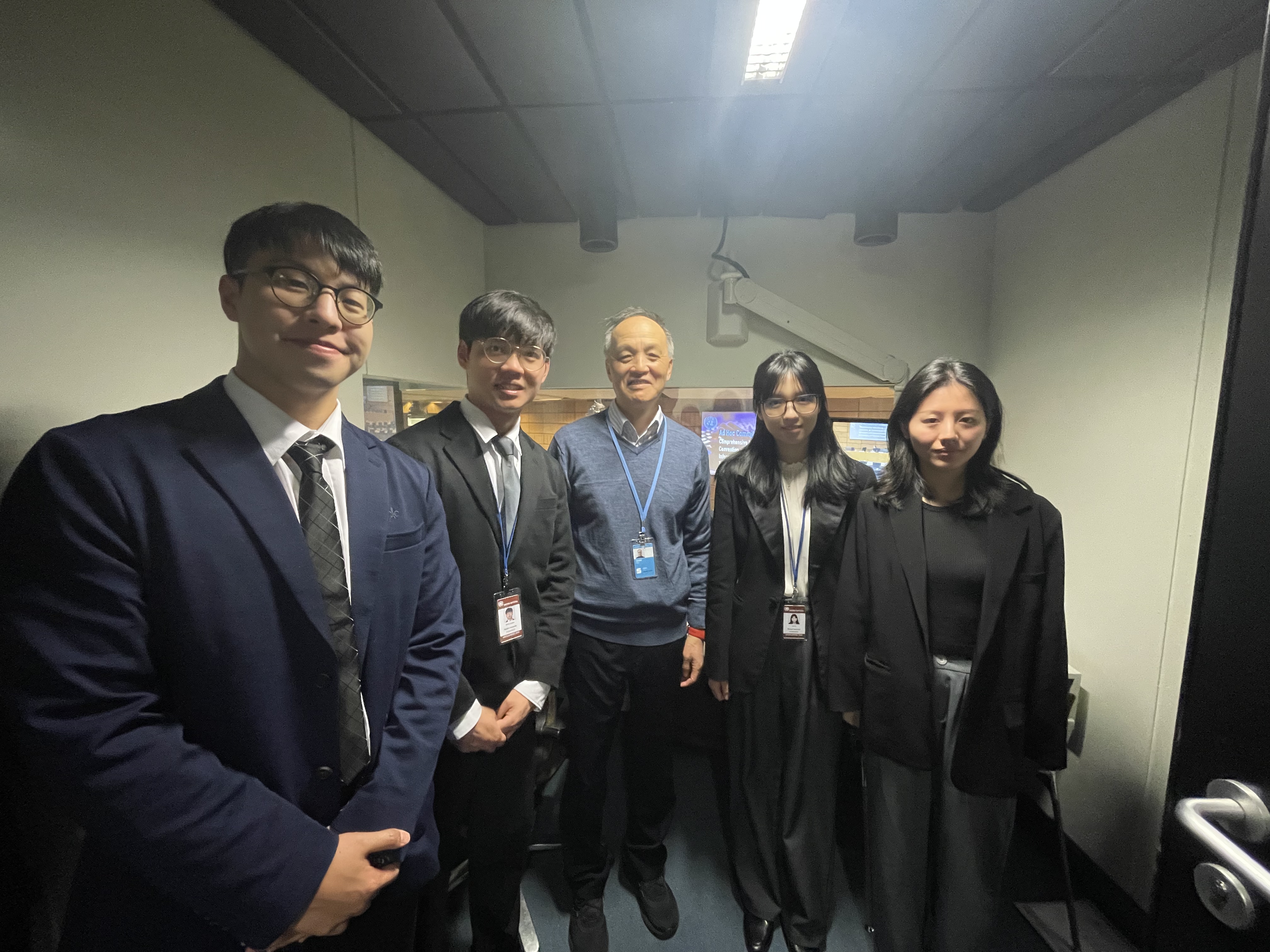 实习第一天,同学们带着丰富的译前准备材料,紧张地投入到了联合国毒品和犯罪问题办公室特设委员会第五次会议的哑厢(Dummy Booth)同传实习任务当中。一开始,同学们对接触到的会议内容仍感陌生。随着会议议程的进一步推进,大家渐渐熟悉了该会议的高频表达和议题内容。中午,师生六人与维也纳办事处王立荣老师在联合国食堂共进午餐。大家在新奇的环境下还略显拘谨,但是在王立荣老师热情的介绍下,大家也愈发放松。餐后,大家在谢老师的带领下前往七楼办公室,与联合国维也纳办事处翻译处代理处长、中文科科长张伟老师会面。张老师与同学们分享自己的求学和职业经历,敦促同学们练好同传基本功。下午,各国与会代表陆续进场,议题继续进行。在同传间,大家见到了广外77级员工,联合国资深译员权斗老师。权老师与同学们亲切交流分享心得,大家深受鼓舞。