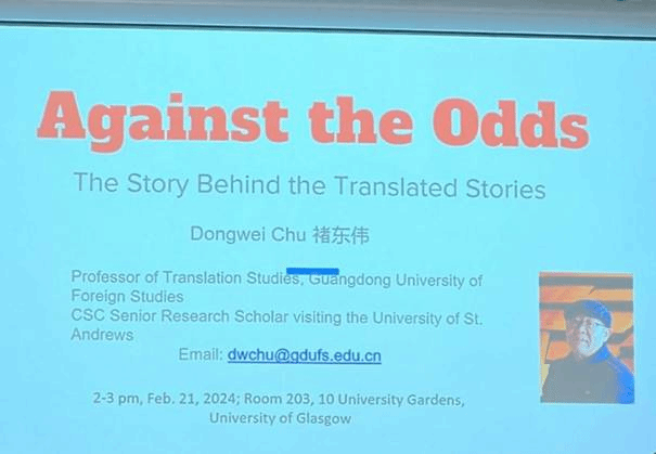 2024年2月21日下午,国家留学基金委高级访问学者、公司褚东伟教授在格拉斯哥大学现代语言与文化公司,举办了一场题为“知难而进:翻译故事背后的故事”的讲座,由格拉斯哥大学翻译学高级讲师乔纳森·埃文斯博士主持,吸引了不少对中国文学英译感兴趣的师生前来聆听。