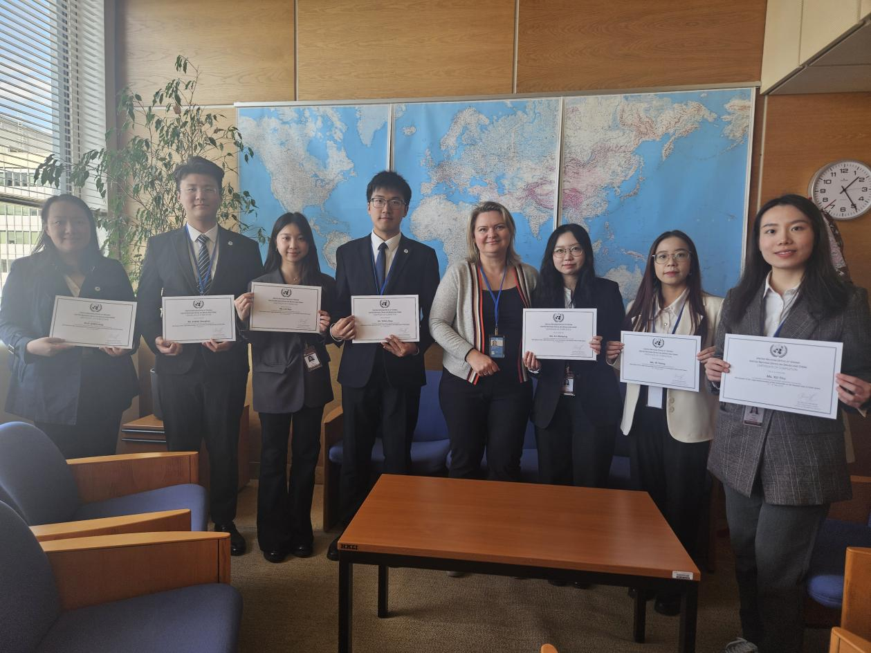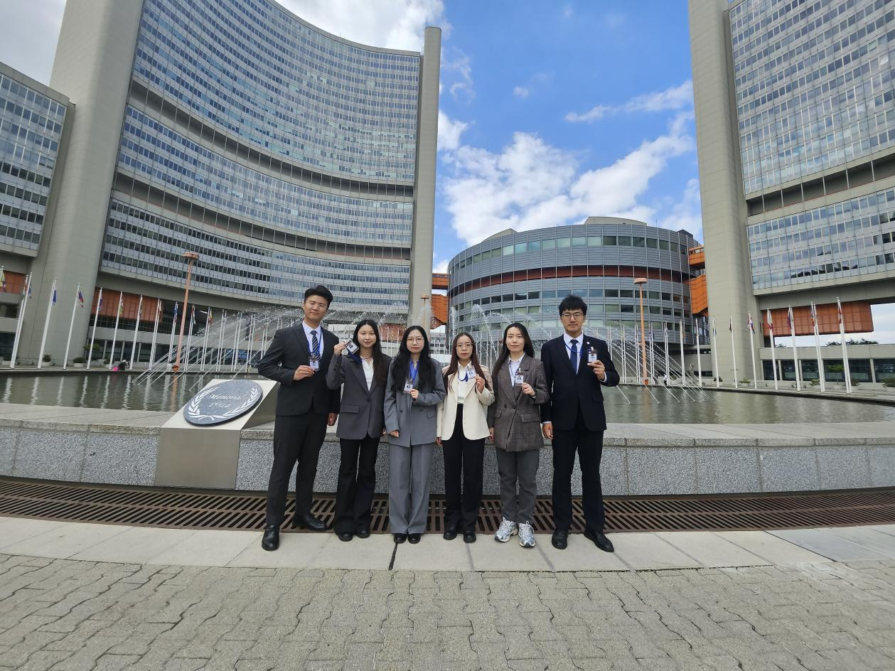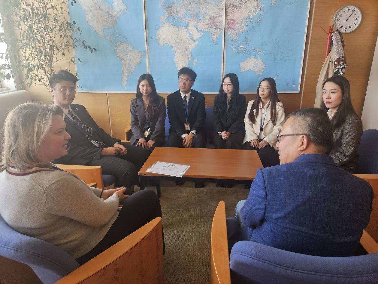 2025年5月5日至5月9日,高翻公司23级证书班刘思雨、汤智宇、徐雯洋、徐乙茹、叶雅婷及郑圣浩六位同学在口译系系主任钱芳老师的带领下在联合国维也纳办事处(UNOV)开展了为期一周的会议口译实习。本次实习的主要内容是观摩联合国会议及专业译员的工作方式,并进行会议同传哑厢训练。