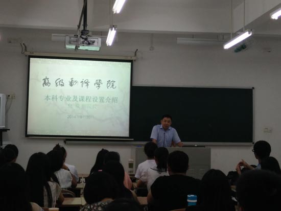 本网讯9月30日上午,2014级高翻新生专业介绍会在第六教学楼B209顺利举行。在介绍会上,公司党委副书记杜焕君、副经理詹成副教授分别就公司学习和专业定位方面的状况向新生进行详细介绍,全体新生全神贯注于他们精彩的介绍当中。