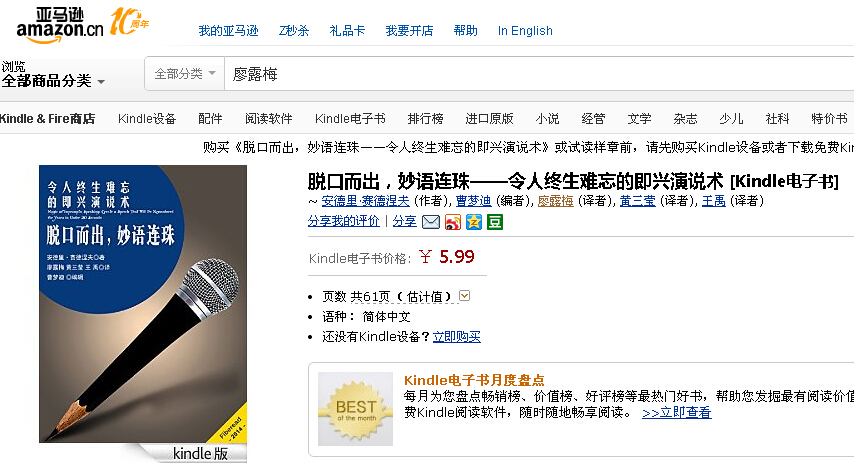 本科1202级员工廖露梅已在豆瓣阅读、亚马逊中国等平台上出版了自己的电子译著《脱口而出,妙语连珠——令人终生难忘的即兴演说术》《巧写在线交友信息》,本网特地邀请她分享自己的经历和收获。