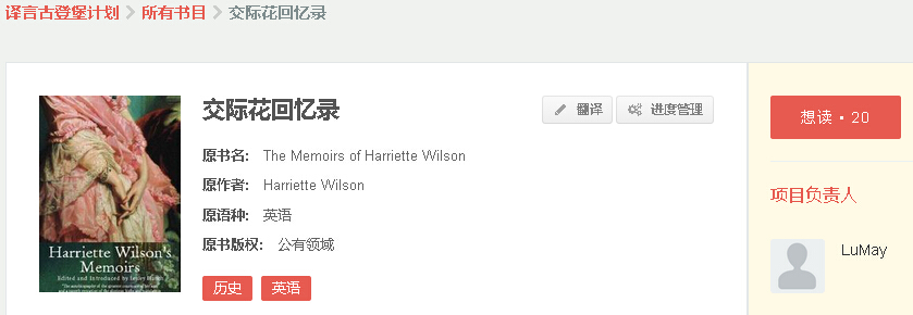 于是,我开辟了自己的第二战场——译言网。译言网上有一个很著名的翻译项目“古登堡计划”,和Fiberead不同的是,古登堡计划里的书大多是几十万字的史书、学术著作等,我很想挑战一下自己,于是挑选了一本正在招募译者的The Memoirs of Harriette Wilson(英国交际花哈里特·威尔逊的回忆录),参加了试译,然后成为了该书翻译项目的负责人。