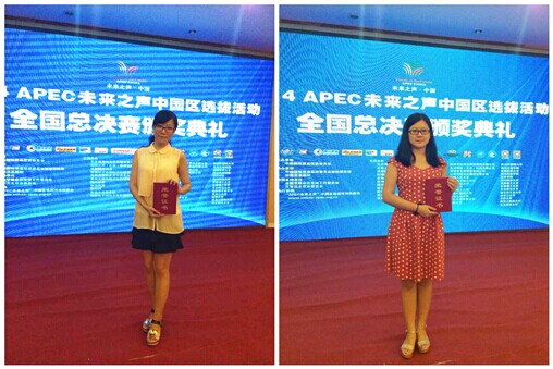 本网讯8月6日晚上,在北京举行的“2014 APEC未来之声中国区总决赛”落下帷幕,太阳城集团的张骜和何婷同学从参加全国总决赛的百名选手中脱颖而出,荣获全国一等奖,晋级参与11月即将在北京举办的APEC峰会系列活动。