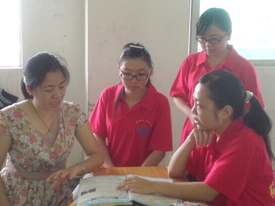范老师(左一)与圆梦队教学培训组组员一起研究初中英语教材