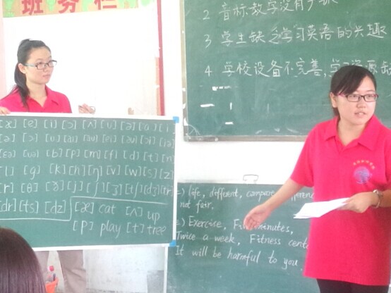 针对小学英语教师团队不足的问题,队员们建议小学教师自学英语,强化自我训练,提升自身英语教学水平,并且采用评教制度,正面竞争,互相促进。针对语音教学缺失的问题,队员李莹演示了语音教学的方法。
