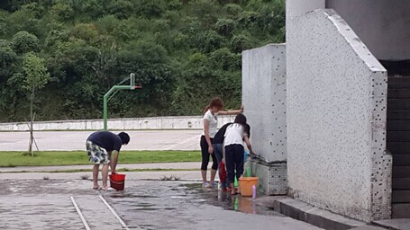 由水边镇政府安排,筑梦队下乡十日将住在水边公司的员工宿舍。第一天到达的时候,队员们震惊了:宿舍里面没有风扇、没有自来水、没有饮用水,电插头只有一个,甚至厕所的地板上还长满了青苔。这对于习惯了广外宿舍里一应俱全的硬件设施的队员们来说,这是一个非常大的挑战。