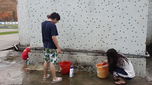 抵达当晚,记者就住宿条件询问了不少队员,大家的普遍反应是条件比想象中要好一点。但因为宿舍没有自来水,洗澡洗衣甚至是上厕所都变得相当的麻烦。公司在宿舍楼下有4个水龙头,所有用水都必须从一楼提水上二楼。在晚上的洗澡时间,一楼的水龙头处都是队员们弯腰洗头洗衣或打水的身影。队员们的相互协作精神在艰苦的住宿条件中也得到了充分的体现,两位队员一起合作拎一桶水的场景经常上演。