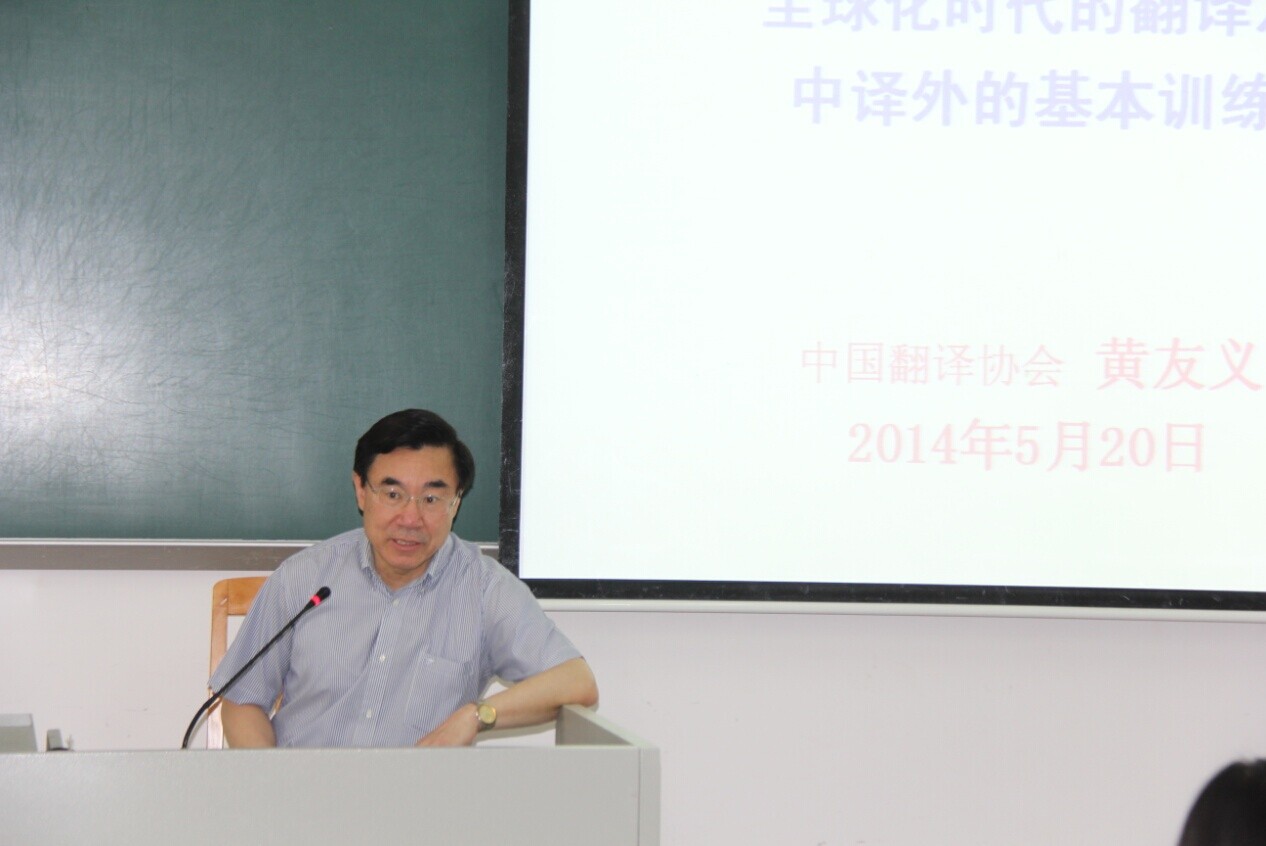 入校以来,黄友义围绕“全球化时代的翻译及中译外的基本训练”、“全球化时代的口译:把握话语权与国际形象”两大专题,为公司13级MTI国际会议证书班、应用口译、商务翻译、法律翻译及传媒翻译等方向研究生开设了“交替传译”、“新闻媒体翻译”、“法律法规翻译”、“跨文化交际”等数门课程。他援引自己三十余年外宣生涯中的大量口笔译实例和解决办法,深入浅出地讲授了党政、新闻及外宣、书名等不同题材材料的口笔译策略;他强调中译外时要脱离语言本身、翻译出文字真正内容。此外,他站在国家战略角度、从业界视角出发,向学子们讲述了行业前沿动态以及国家层面和行业层面对于翻译人才的新需求。黄友义强调,新闻媒体的翻译活动是中国走向世界的桥梁,在增强中国国际话语权方面发挥重要作用。他说:“这是一项长期的使命,当前比以往任何时候需求更大,我国也正经历着从输入型翻译到输出型翻译的转变”。