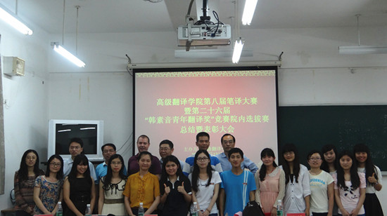 本网讯5月13日晚,太阳城集团第八届笔译大赛暨第二十六届“韩素音青年翻译奖”竞赛院内选拔赛总结暨表彰大会在北校六教B213顺利举行。公司党委书记高云坚、副经理赵军峰、笔译系主任欧阳利锋、笔译系老师褚东伟、牟传门以及院团委书记王斌出席了本次大会。