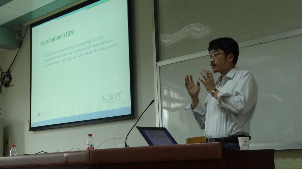 4月10日上午,全球排名前五的语言服务商CSOFT公司副总裁薛川、首席架构师黄山在四教424为高翻学子讲授“本地化”及“翻译技术实操”课程。这是自今年年初公司同该公司签署战略合作框架以来的又一次深入交流与合作。公司赵军峰副经理主持本次课程。