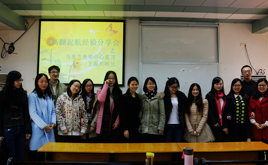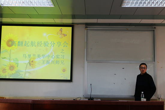 本网讯1月15日下午2点30分,“高翻起航”经验分享会之马里兰美华中心实习篇在四教424召开。被派往马里兰大学美华中心,进行为期半年实习的公司12级MA研究生王振兴为口译队成员分享了他在美国的经历。公司党委副书记杜焕君和辅导员王斌出席了本次分享会。