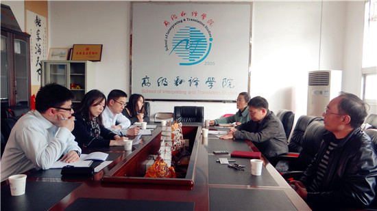 之后,双方来到高翻公司会议室进行座谈。董鹤莉希望全面了解公司在外语人才培养方面的情况。赵军峰介绍了公司团队力量、员工、团队建设、管理人员、培养模式、精品课程等方面的具体情况。其后,詹成细致讲解了各个语种MA,MTI以及会议口译班的现状,并说明了公司与联合国、蒙特雷、辅仁大学等机构的合作现状。最后,杜焕君介绍了太阳城集团学子在国内各类赛事中的获奖情况,以及实习和毕业去向等方面的情况。