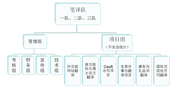 从自身特点出发,广外高翻笔译队制定了一系列制度,如项目负责人制度、队员自查制度、翻译审校制度、奖惩制度等。我们参考翻译公司部门设置,设立了以下部门:财务组、技术组、考核组、宣传组。财务组负责制定翻译报价单,译员和审校的工资,统计翻译、审校字数,根据考勤情况确定工资数额,发放工资,记录支出明细等工作。技术组主要职责包括安排机算机辅助翻译技能培训,为长期项目建立翻译记忆库、术语库等。考勤组主要负责队员信息统计、翻译和审校字数统计、实施奖惩、建立更新队员成长档案等工作。宣传组主要负责及时发布队伍动态,搞好队伍宣传推广工作,邀请知名翻译家或翻译管理人才来校开讲座,提高笔译队在公司以及整个广东省的知名度。笔译队未来计划设立一个项目组,将目前的项目管理人员纳入到该组中,对项目管理人员进行培训同时储备翻译项目管理人才。接下来,基于当前笔译队的语料库,我们会在此基础上申报相关的科研项目,做到实践为科研服务。
