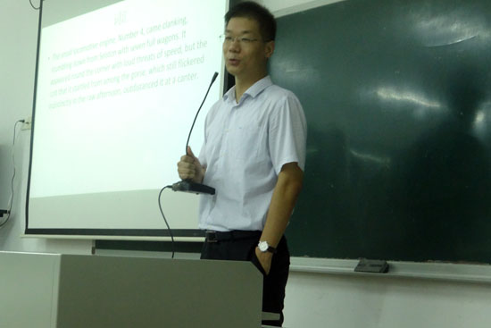 邢杰老师通过一个个生动形象的例子,引导同学们开拓思维。在词汇方面,他建议同学们在平常学习中留意词汇运用的差别,了解拟声词等特殊词汇,形成良好的阅读习惯;在短语方面,他提出了习语对阅读的影响;在句型方面,邢杰老师重点强调了要根据中英文语序的不同对译文作出相应调整;而在文化差异方面,他则以“土豆”、“玉米”等在中文方言中表述各异的生动例子,引导同学们注意文化的差异。