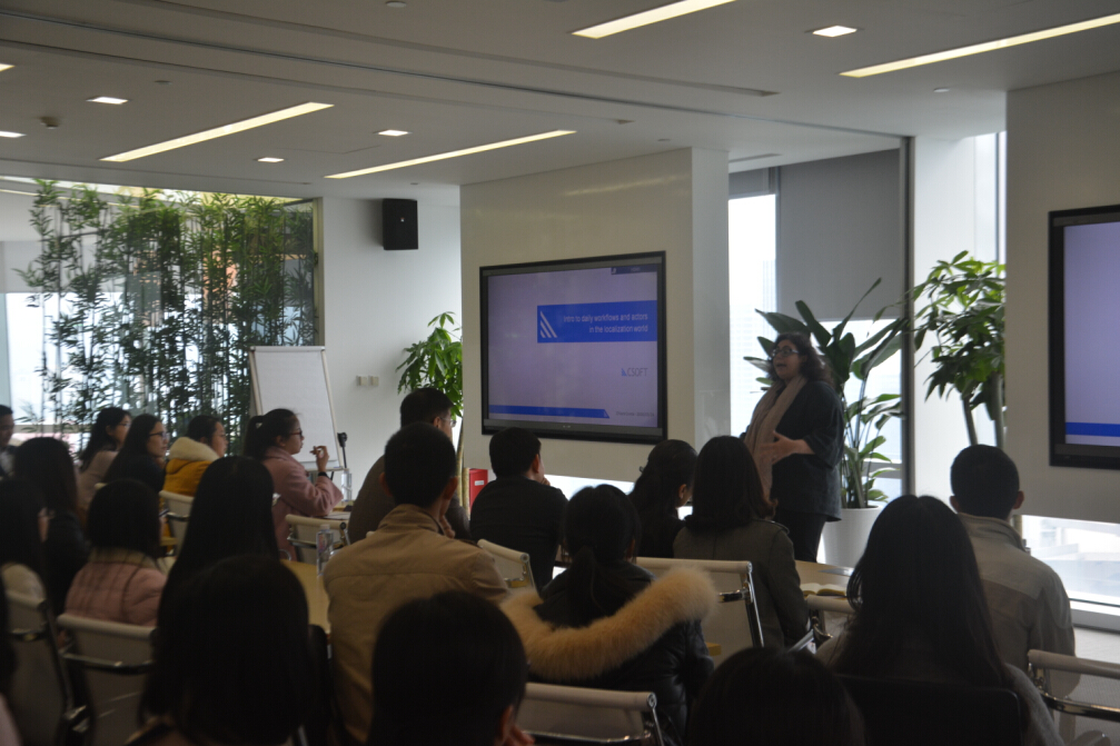 CSOFT 成立于2003 年,是行业领先的语言解决方案与全球化服务提供商,致力于提供业内领先的客户体验。作为精通中英法三语的国际型人才,高经理首先向一行人介绍了本地化(Localization)的概念并通过PPT以及视频等方式展示了普通民众对本地化行业知之甚少或者存在误解的现象。随后他介绍了公司在全球的运营状况,包括公司提供的本地化服务项目类型、为用户特别定制的项目方案、公司合作伙伴覆盖的产业范围等。他特别提到,目前公司主要以笔译英译汉为主,但为了针对国内有“走出去”战略计划的企业,帮助他们打开国外市场,传递中国企业价值,为他们打开国际市场提供一站式的本地化服务,中心计划加大汉译英及口译方面的服务。
