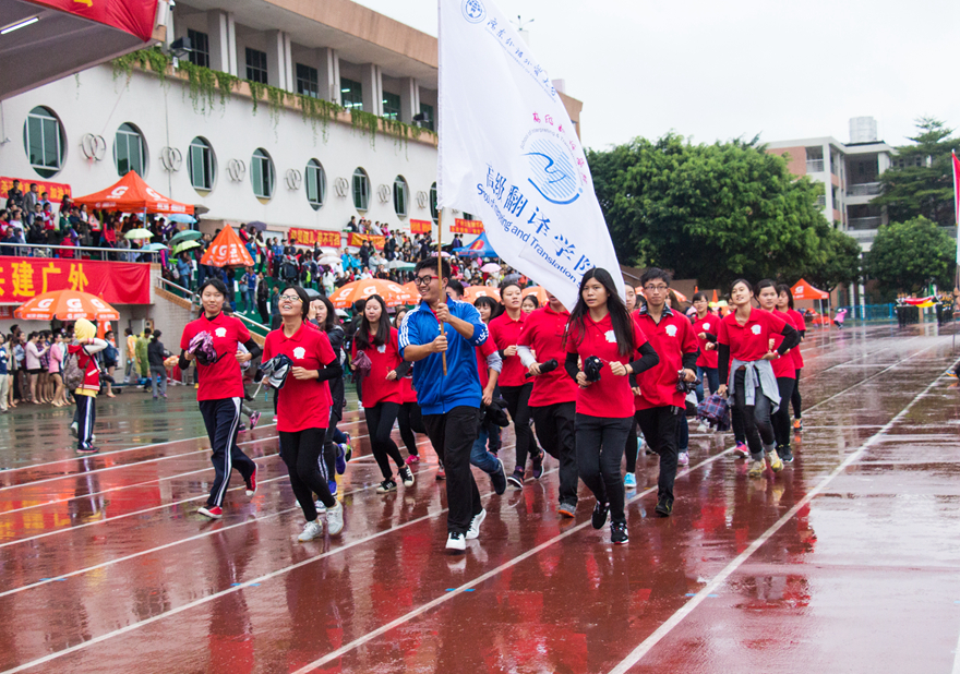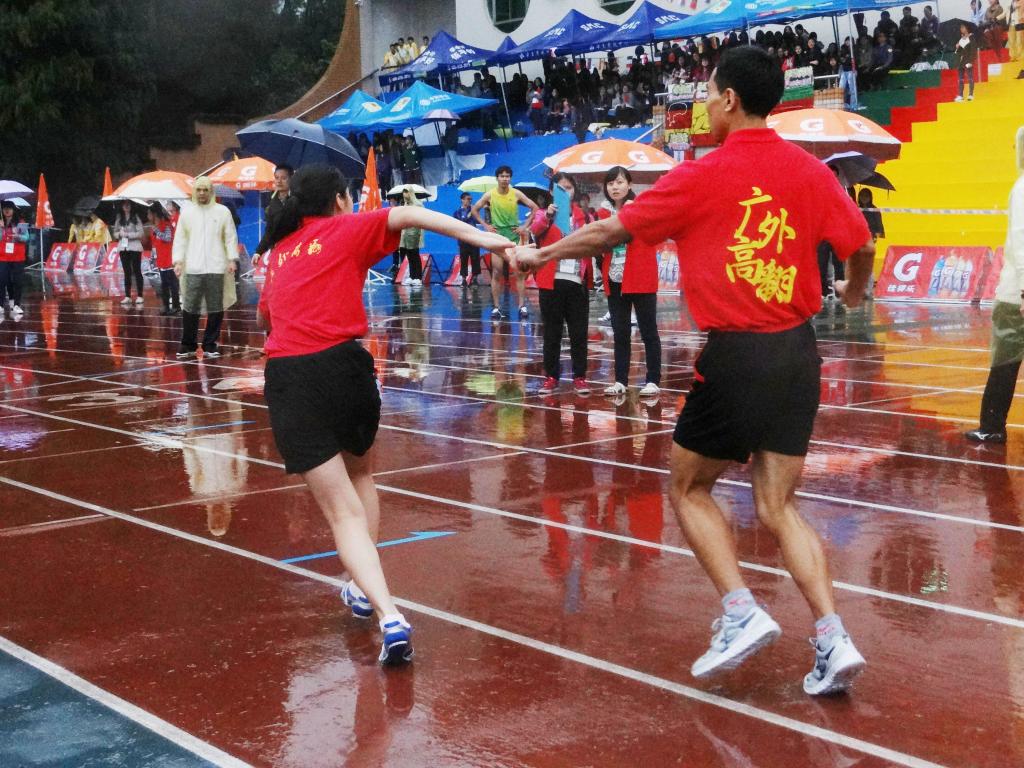 “高翻学子,好样的!”在女子400米预赛时,天空又下起了零星小雨,但参赛选手洪爽、陈智珲变身成为“女汉子”,不怕风吹雨淋,在赛场展现了他们迅猛勇敢的一面。