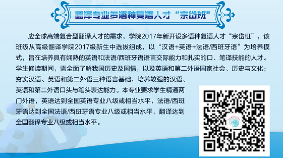 为培养多语种高端翻译人才,今年公司开设翻译专业“宗岱班”,采取“汉语+英语+法语/西班牙语”培养模式,培养具有娴熟的英语和法语/西班牙语语言交际能力和扎实的口、笔译技能的人才。“1个学习周期/1份的学费+9份的汗水=达到三个外语八级水平”,更是备受广大考生和家长热捧。