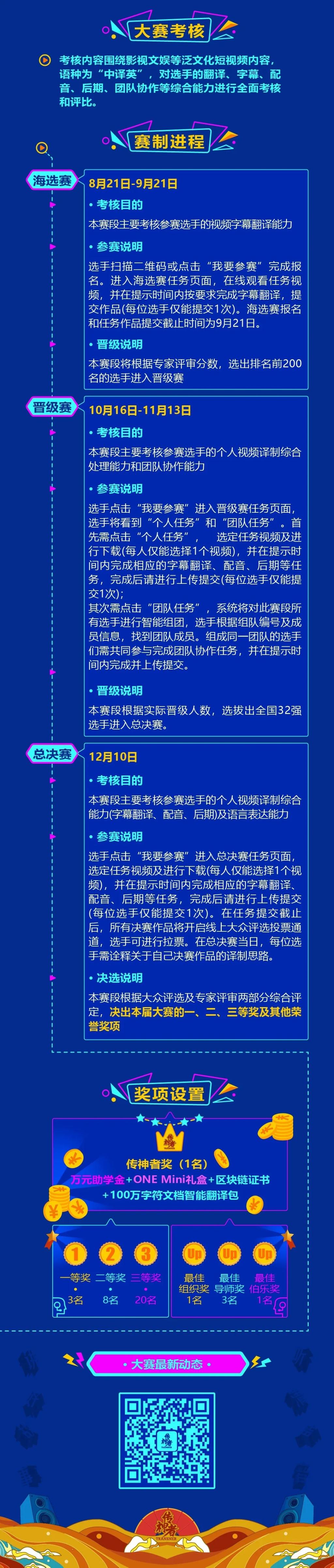大赛分海选赛、晋级赛和总决赛三场,采取淘汰制。全程将从视频字幕翻译、视频配音、视频后期制作、团队协作等多方面考察参赛选手的视频译制能力。