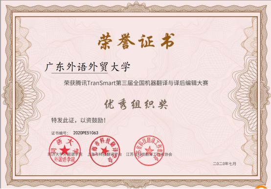 2020年5月18日,腾讯TranSmart·第三届全国机器翻译与译后编辑大赛正式启动,吸引了来自国内外的4000多名选手报名参赛,2020年7月18日,经过两个多月、两轮比赛的角逐,60名参赛者脱颖而出,分别获得特等奖、一等奖、二等奖、三等奖和优胜奖。太阳城集团学子积极参赛,取得了优异成绩。公司荣获优秀组织奖。