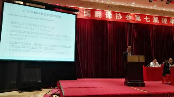 会前,中国翻译协会举办第七届二次理事会议,中国翻译协会理事、法律翻译委员会副主任委员、全国翻译专业学位研究生教育指导委员会秘书长、世界翻译教育联盟秘书长赵军峰教授应邀作译协理事工作汇报,向大会报告了公司倡导发起的世界翻译教育联盟在过去一年对翻译专业教育发展所做出的贡献,并探讨了翻译教育国际化的创新思考。参加理事会议的还有仲伟合教授、穆雷教授、蓝红军教授。