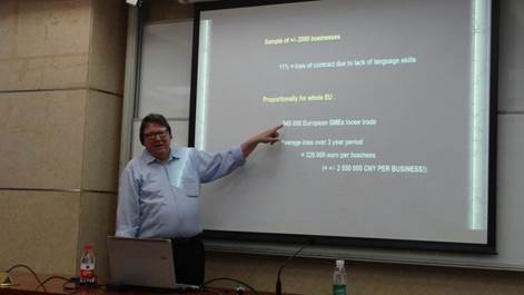 讲座主要围绕多语种的使用以及欧盟翻译发展现状展开。Frans De Laet教授从欧盟的历史讲起,带领同学们回顾了欧盟的产生、发展及现状,特别是其复杂的政治结构以及各个机构间的联系。FransDe Laet教授提到欧盟经济的发展离不开多语言的使用。目前欧盟共有24种官方语言和6种半官方语言,如果欧盟文件都以英文书写,英国将因此大大获利,但英语是否应该是贸易往来中的第一大语言呢?为什么不选择统一的世界语呢?