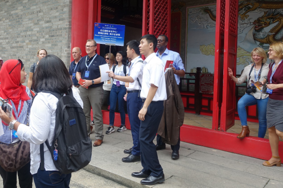 蔡嘉晖(右五)在南海神庙为与会嘉宾提供讲解翻译