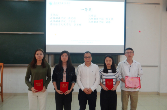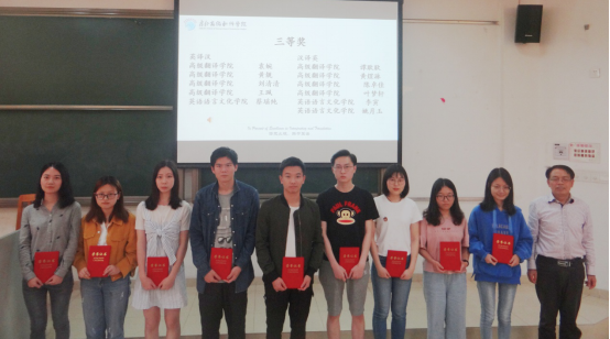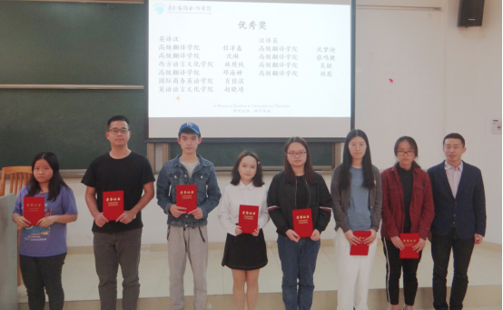 无论是获奖选手还是在场观众,都从两位老师的精彩点评中受益匪浅。随后,现场开展了有奖问答环节,观众就诗词回译、新词新译进行抢答,充分体现了广外学子的风采。随着最后一轮抢答结束,大会迎来了期待已久的颁奖环节。颁奖嘉宾为获奖同学颁发奖状,并勉励他们继续打磨译文,争取在第三十一届“韩素音国际翻译大赛”中勇创佳绩。