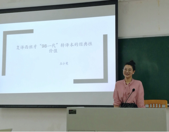 博士生王小曼从转译、直接翻译与复译活动的特点以及“98一代”在西班牙和中国文学的地位比较出发,阐明了自己的研究缘起。依据研究问题,主讲人首先对所涉及的重要概念进行了阐释和比较,主要包括“转译、间接翻译、重译与复译”,“翻译文学与文学翻译”以及“经典、经典性与经典化”。其次,她分析了“98一代”文学矛盾的境遇并对复译的经典性价值进行探索。最后,她尝试提出了“98一代”文学经典化的路径。