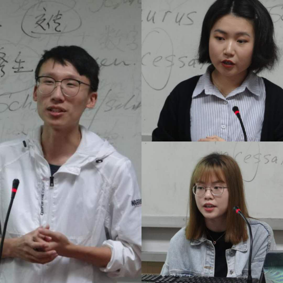 接下来是榜样分享环节。国家励志奖学金获得者陈文理同学向在场同学分享了大学四年的生活、学习规划,并介绍了自己通过组建学习小组练习精听和交传、阅读英文小说和公众号文章提高听说读写译能力等学习方法。国家奖学金获得者李璇向在场同学介绍了国家奖学金的评选条件以及综合测评的评分标准,并结合自身经历,用曾经参与的一些大型志愿活动经历来鼓励同学们不断拓宽自己的知识面,了解不同领域的事物。先进班集体标兵代表马天祺则分享了班级建设取得的成绩,为其他班级提供了重要的借鉴意义。