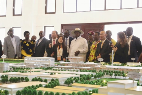 蔡易君(戴工作证)为乌干达总统(戴白色帽子)讲解园区布局及功能