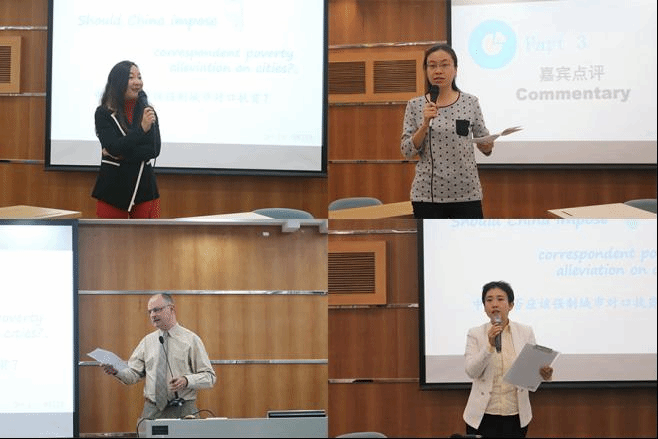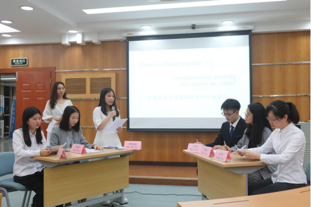 短暂的休息过后,中英对话环节开始了。本环节英文、中文讲者各三个,讨论“中国是否应该强制城市对口扶贫”这一话题。由中文辩手何诗琦、英文辩手彭诗琪、王洁雯组成的正方认为国家管控和分配更有利于城市之间互相帮扶,优势互补,提升居民幸福感;由王俊值、方可、彭嘉仪组成的反方则分别用中文和英文从“精确”“稳定”“平衡”三方面进行论述,指出“不强制对口扶贫”更能使资源合理分配,平衡区域发展。双方条理清晰,论据充足,为观众们呈现了一场别开生面的对话。