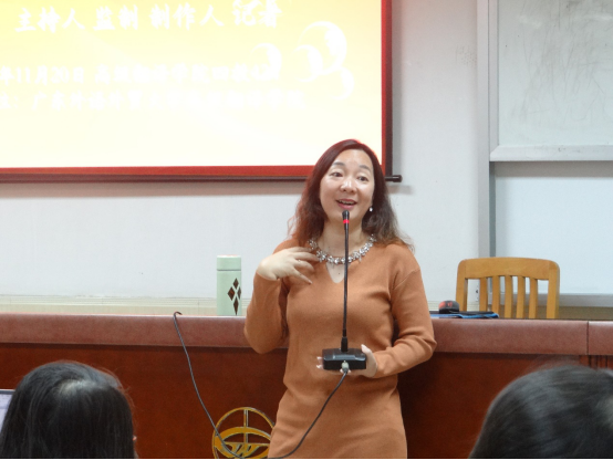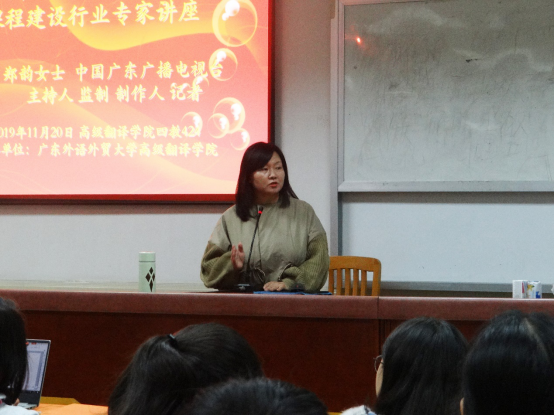 为提高翻译学子讲好中国故事的能力,开拓讲故事的视野,11月20日晚上,记叙文写作与口述暨当代中国地方人文故事叙说课程建设行业专家讲座在第四教学楼424室精彩开讲。主讲人为中国广东广播电视台主持人、监制、制作人郑韵女士。