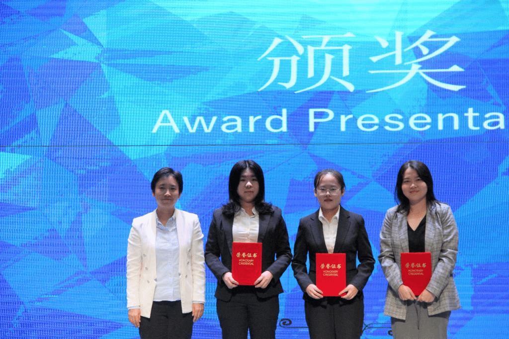 王巍巍老师为优秀奖获得者敖佳、窦鸿钰、张瑶颁奖