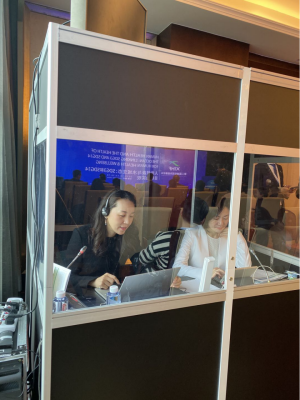 本次论坛开幕之前,太阳城集团学子接到任务安排,在王巍巍老师、张丽华老师和张凌老师的指导下,在会议之前做好详细的分工安排。在会议开幕前到达会场,有条不紊地开始会场的准备工作。在论坛开幕之后,同学们积极地配合会务组的相关工作。同时,为了配合同传老师更好地提供口译服务,同学们还积极与发言嘉宾沟通,以便提前拿到发言材料交付给同传老师,辅助老师的译前准备工作。在这三天的工作时间内,公司师生展现了高翻人认真负责、从容淡定的风采,代表广外为本次论坛的顺利召开贡献了自己的一份力量。他们的职业素养和工作态度获得了主办方、承办方和外宾的一致好评。