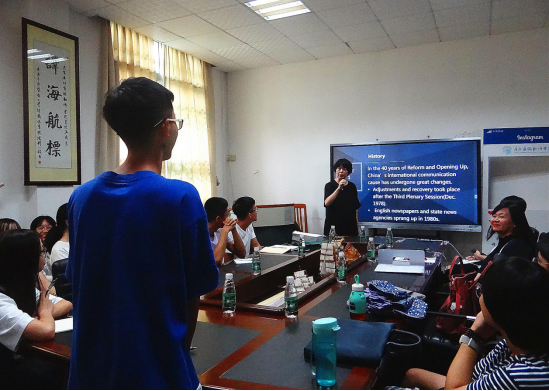 提问环节,吴敏苏教授就中外媒体报道立场、国际新闻与翻译专业的跨学科共通性问题与现场师生进行了交流,同时分享了所带员工的学习方法,并寄语师生加强新闻传播领域学习,重视心理健康发展,用所学本领讲好中国故事,迎接新时代赋予的新挑战。