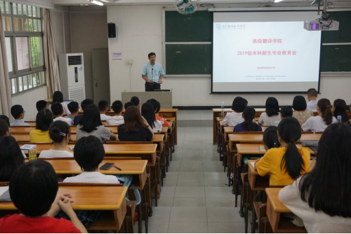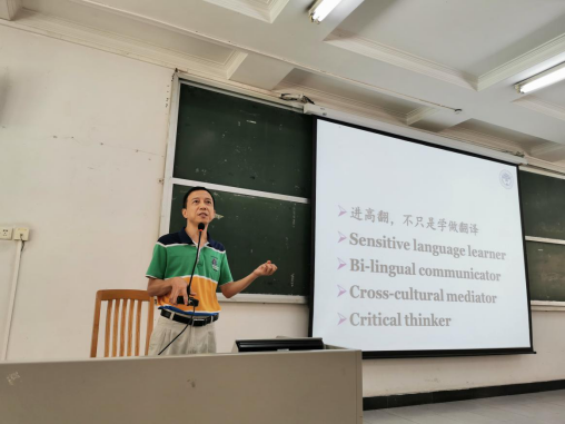 随后,副经理胡正茂给全体新生作了“在高翻,做出色的自己”主题讲座。他谈到,在高翻,不只是学做翻译,一是要学会“一切清零,重新开始”,学会自我管理,自我规划;二是要培养语言敏感性和文化敏感性。同学们除了要学好翻译,更要培养双语交流能力、跨文化意识和批判思维能力等。