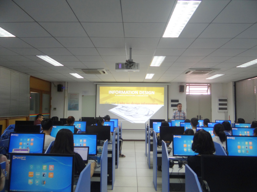 6月29日上午,由美国威斯敏斯特公司的Curtis Newbold副教授主讲的课程Information Design率先开讲。该课程是视觉传达设计的入门课程。在本课程中,员工将全面了解视觉元素对人们理解和经历的影响,学习如何在专业技术背景下,进行布局、色彩、排印、摄影和数据可视化的战略决策。第一堂课上,Curtis讲述了信息设计的概念和方法在商业活动与日常生活中的运用和体现,引导同学们思考信息设计的定义与意义,通过多种形式的互动激发同学们对课程的兴趣。在给出信息设计的专业解释之前,他鼓励大家动手写出定义,并尝试着用绘画的方式呈现自己的理解以加深对信息设计的认识。此外,Curtis还讲解了信息传播的原理,探讨了修辞艺术的作用。