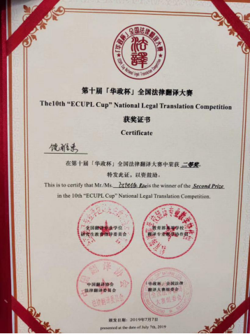 饶雅惠荣获第十届华政杯全国法律翻译大赛二等奖