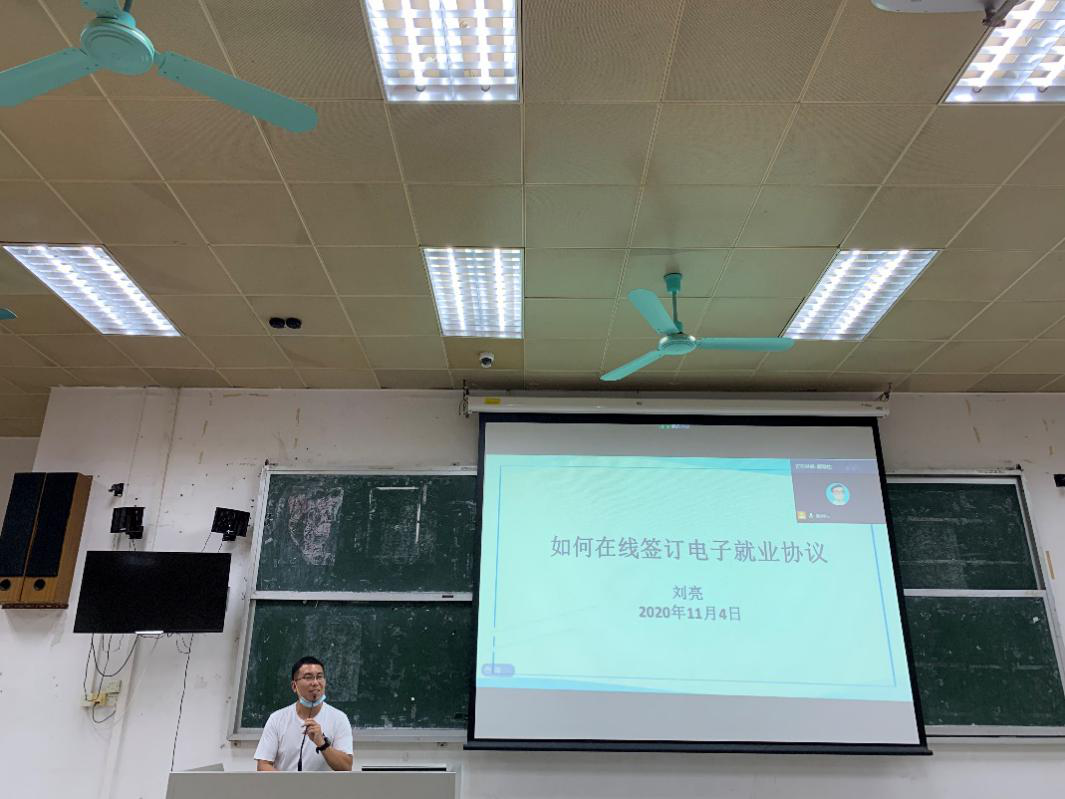 辅导员刘亮与同学们交流分享了若干具体的就业相关问题与技巧。首先他具体讲述了在线签订电子就业协议的流程,提醒同学们注意按照步骤操作。同时他强调了就业中简历的重要性,分享了简历制作的若干注意事项,其中特别提到了要小心仔细注意简历中的细节问题。接着分享了一些收集就业信息的途径,提醒同学们要从多个来源获取信息,尤其需要重视可信度。刘亮还就面试的一些注意事项进行分享,如四种不同的面试方法和其对应的能力维度,一些常见的面试问题以及回答问题应该遵循的基本规则和礼仪。他强调,在找工作期间,一个好的状态尤其重要,要摆正心态,发挥出最好水平。