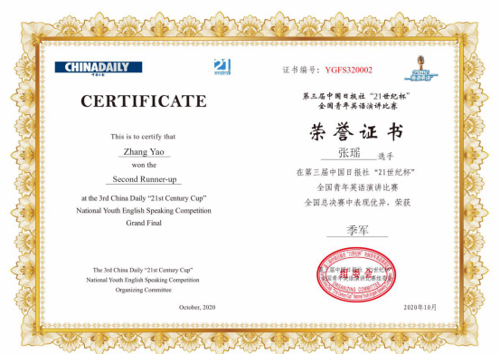 张瑶获第三届中国日报社“21世纪杯”全国青年英语演讲比赛季军