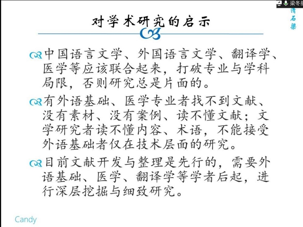 最后,梁教授分享了她在研究过程中关于学术研究的启示,指出了翻译文献史料数量依旧相对较少,利用程度和效果的问题,提出学科之间应该打破专业和学科局限,进行跨学科合作的设想。梁教授总结,翻译史料研究虽然艰苦费时,尤其是文言文,方言等使研究难度加大,但是没有新史料,所谓的新方法、新理论就无用武之地。报刊文献研究的应用价值巨大,具有极强的时间延展性,空间延展性与学科延展性。
