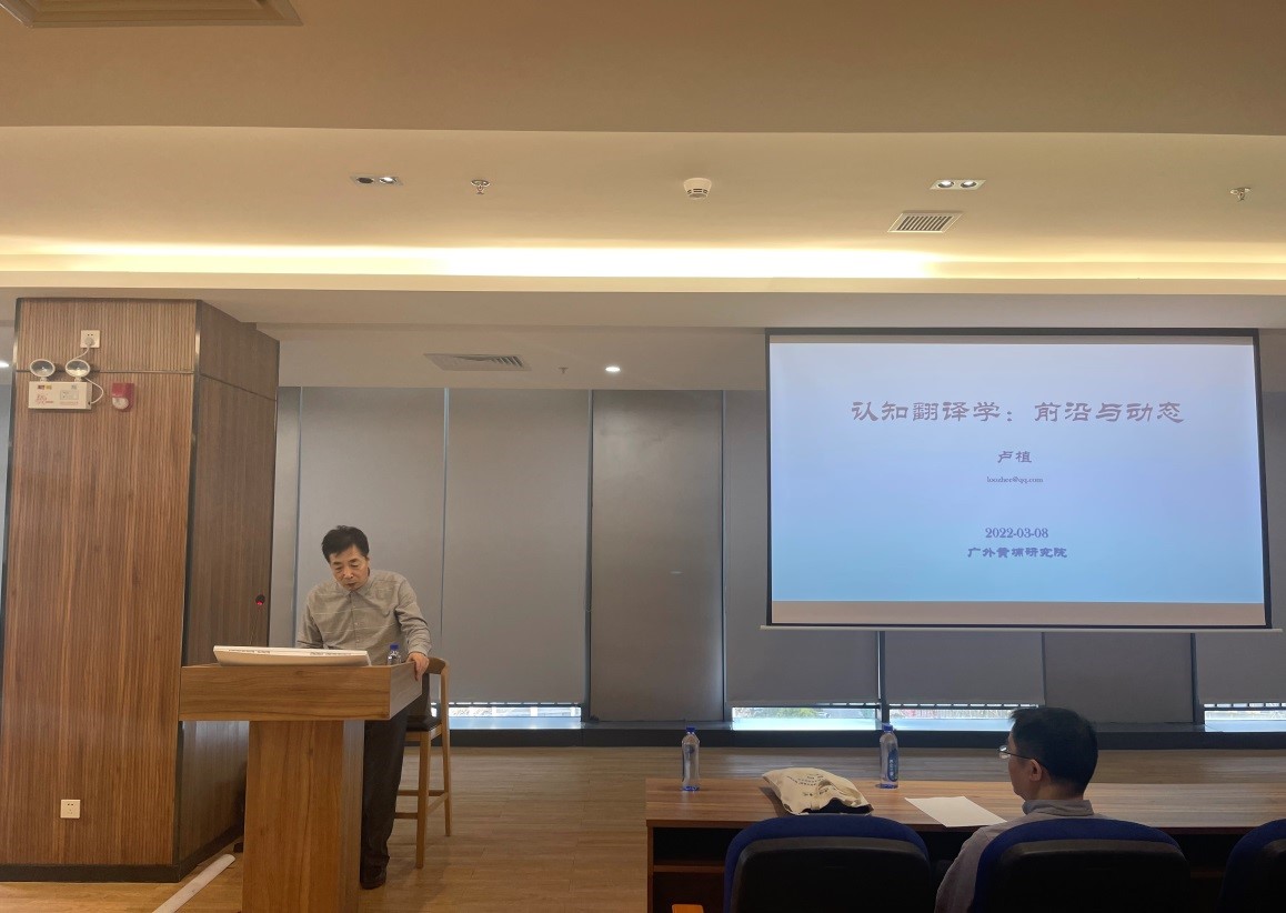卢植教授的讲座总共分为五部分,分别是引言、认知·语言·翻译、认知翻译学:范式、认知翻译学:动态和认知翻译学:前沿五部分。